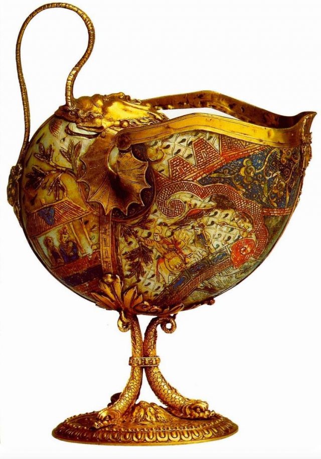 在文艺复兴和巴洛克时期,艺术家惊于其优雅神秘的美感,将其打造成了奢华的酒器,欧洲历代显赫王室和贵族都以拥有工艺极致的鹦鹉螺杯为荣。现在仍能从这些鹦鹉螺杯中窥探出当年的东方元素。