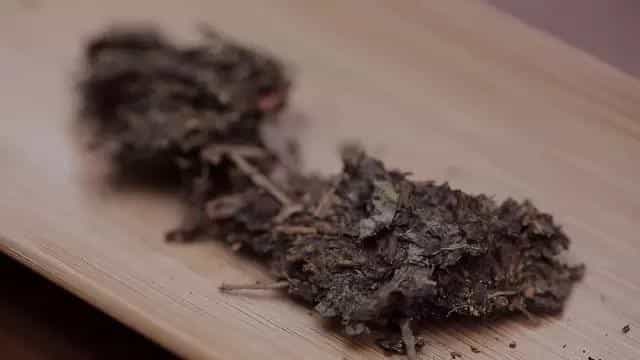 将准备好的5g茯砖茶投入到盖碗中,茯砖茶的投茶量一般5g足矣,过多则茶汤过浓,无法品尝到茶叶原本的口感,还会导致轻微的苦涩。