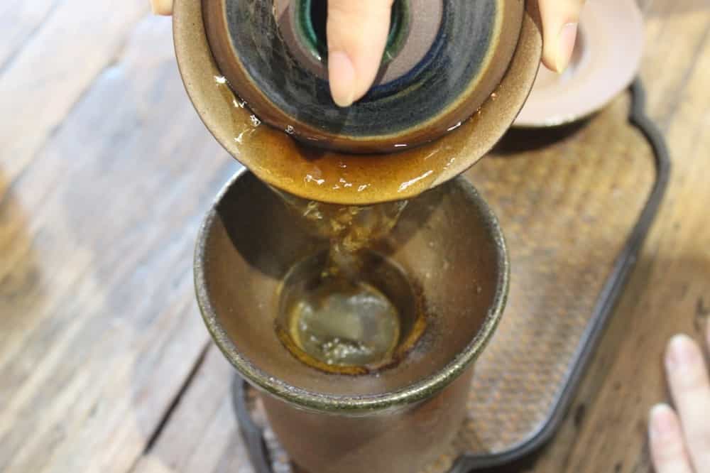 出汤后,将公道杯中的茶汤一定要倒干倒尽。