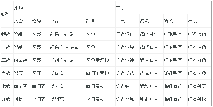 特级外型条索紧直较细,毫毛显露;内质汤色红浓,陈香浓郁,滋味醇厚,叶底较褐红较细嫩。