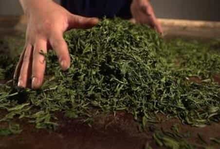 为了茶叶更好的冲泡,揉捻这一步是需要做的,它有助于让茶叶细胞中的内含物质溢出。那么特级和一级的茶叶,杀青到达适合时候可以在锅内抓带几下,起到轻揉和理条的作用,而二、三级原料杀青起锅散热后,轻揉1到2分钟,直到茶叶稍卷弯曲即可,揉捻边揉边抖,压力要轻,速度要慢。