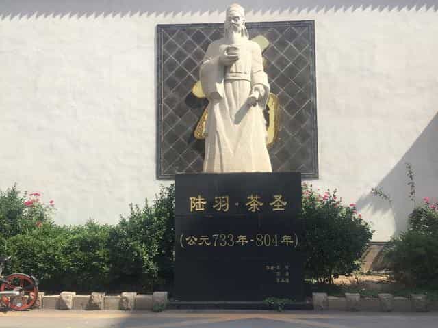 沿着第一茶市的中轴线往前走,在最南端的中间位置可以到“茶圣”陆羽的塑像,陆羽出生于公元733年,是唐代著名的“茶学家”,著有世界上第一部茶叶专著《茶经》,陆羽一生爱喝茶,对茶叶有极深的研究。