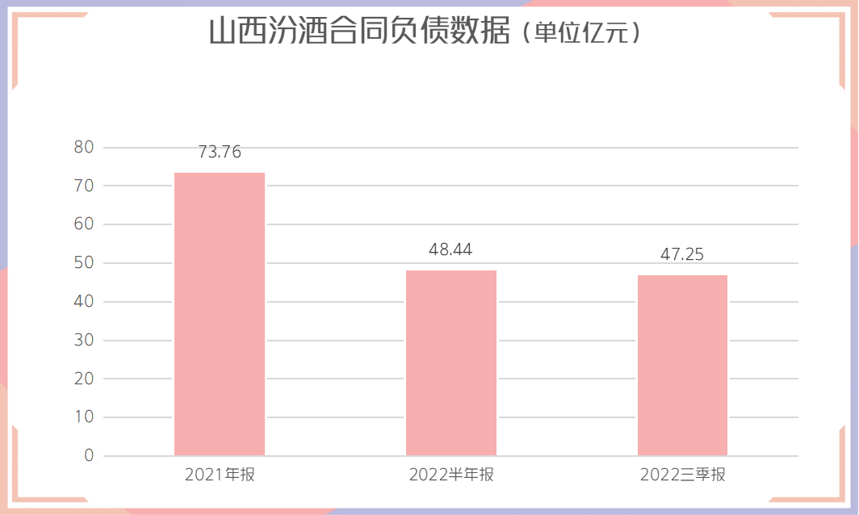 数据显示,截至2022年9月30日,山西汾酒合同负债为47.25亿元,较2021年年末的73.76亿元,下降了26.51亿,降幅约为35%。要知道,去年山西汾酒这一数据却是大涨,彼时增幅约为137%。